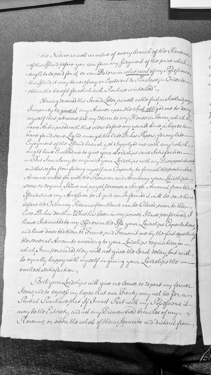 A letter responding to inquiries about the nature and value of the Island's revenue branches. The writer explains their inability to provide detailed accounts immediately upon receiving letters in Scotland, having returned to town to search for relevant papers from the late Duke. They inform the recipients of their disappointment at not yet receiving proper accounts from the Island and direct their officers to compile and transmit the required documents, while expressing hope that any purchase negotiations concern the entirety of possessions rather than partial branches.
