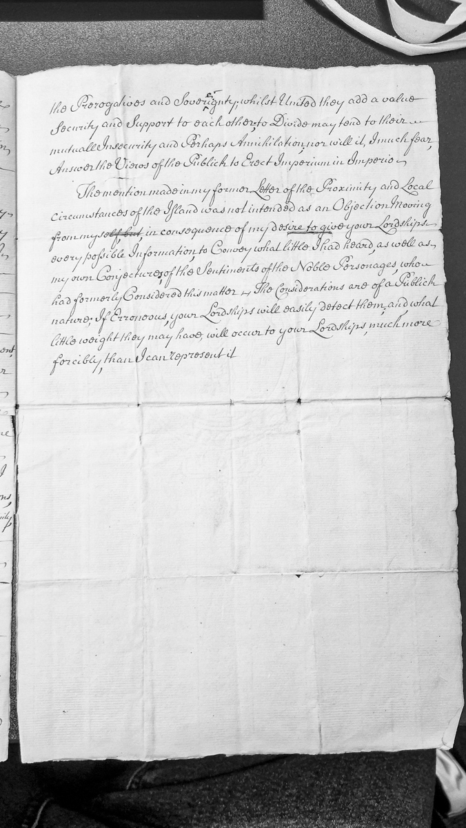 - A fragment of correspondence discussing constitutional matters concerning the Isle of Man's sovereignty and prerogatives. The writer cautions against dividing authority (imperium in imperio) and emphasizes the importance of unity for security. The passage references a former letter and discusses local circumstances and sentiments of noble personages previously considering the matter.