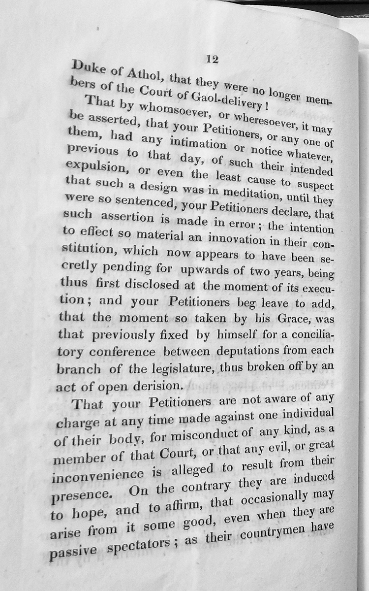 - This is an excerpt from a petition protesting the expulsion of members from the Court of Gaol-delivery by the Duke of Athol. The petitioners claim they received no prior notice or warning of their intended removal, and argue that this constitutes a material innovation to their constitutional status. They also note that no charges of misconduct have been made against any member.