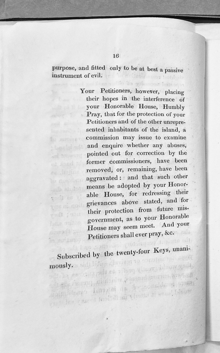 Petition by the Keys requesting commission to examine abuses and redress grievances