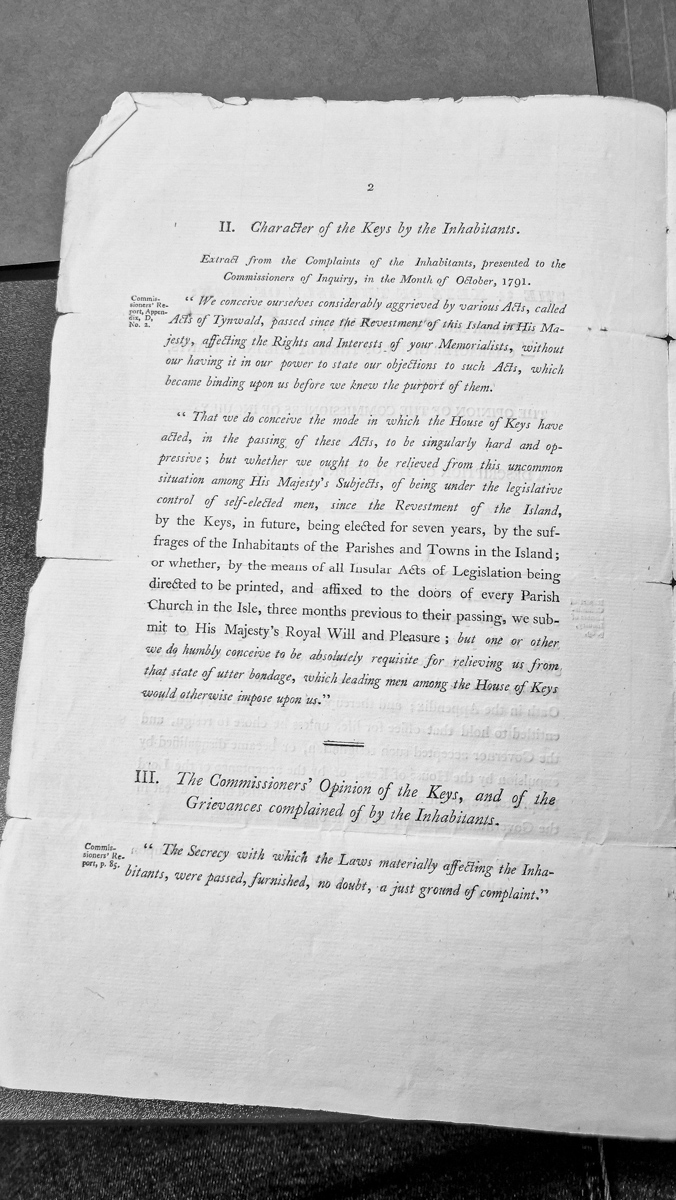 - Extract from complaints presented by Isle of Man inhabitants to the Commissioners of Inquiry in October 1791, addressing grievances about Acts of Tynwald passed without public consultation or inhabitant input since the Revestment. Includes the Commissioners' response acknowledging the justness of complaints regarding the secrecy of law-making.