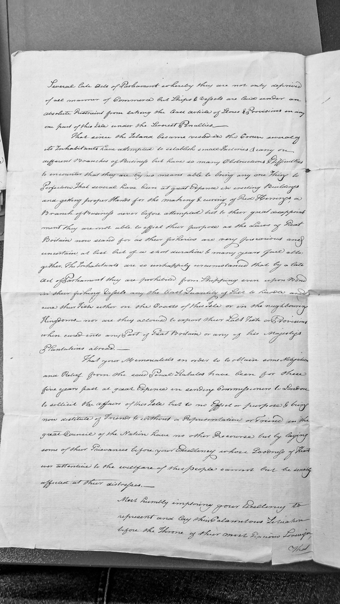 - A petition from Isle of Man inhabitants detailing their grievances regarding parliamentary acts that restrict commerce, fishing, and the export of provisions. The petitioners describe their failed attempts to establish industries such as herring curing and salt fish production, and their unsuccessful efforts to obtain relief through commissioners sent to London over five years.