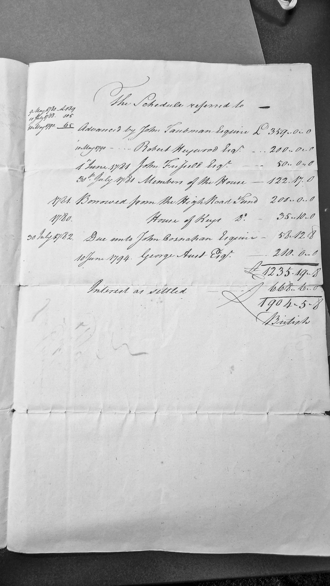 A financial schedule documenting advances made by various esquires and entities to what appears to be a Manx institution or project between 1780-1794. The document lists individual loans, borrowings from the High Road Fund and House of Keys, calculates accumulated interest, and provides a total sum of £1904-5-8.