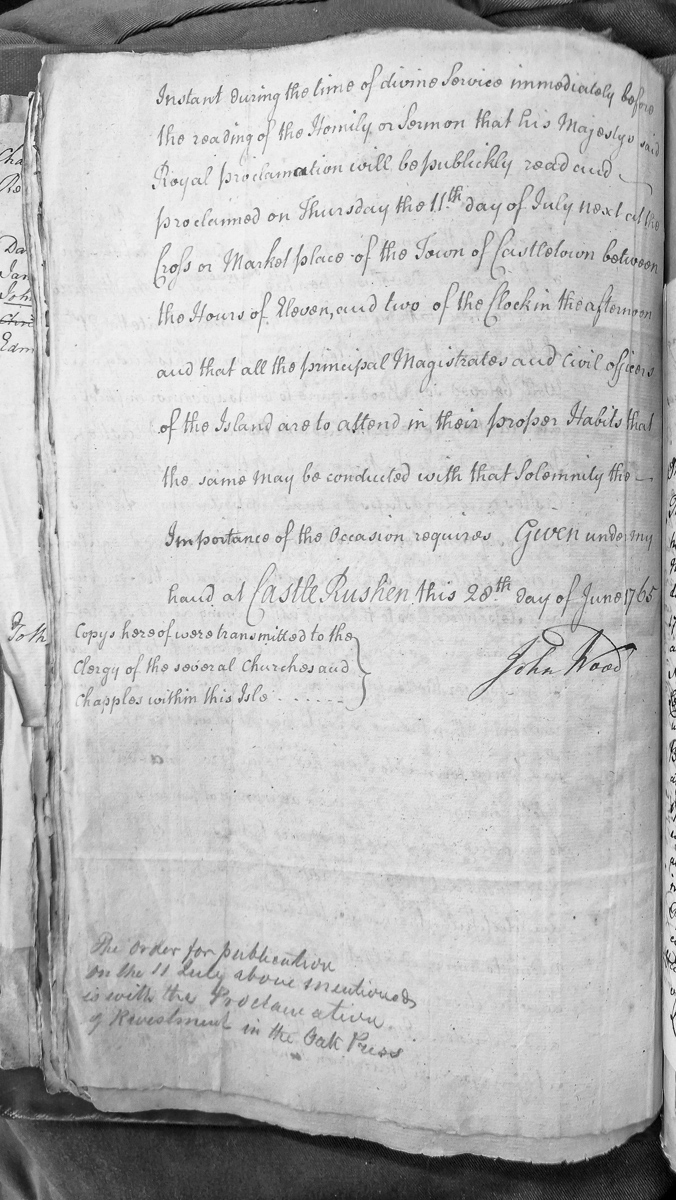 - Order for public proclamation of royal proclamation at Castletown, 11 July 1765