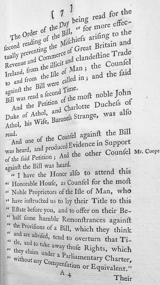 Parliamentary record of the second reading of a Bill concerning illicit trade affecting the Revenue and Commerce of Great Britain and Ireland in relation to the Isle of Man. A petition from John Duke of Athol and Charlotte Duchess of Athol is read, with counsel presenting arguments and evidence regarding the proprietors' title and rights under a Parliamentary Charter.