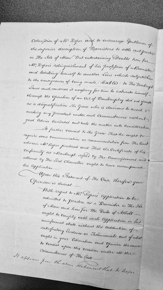 - A legal opinion request concerning the admission of Mr Roper to practice as a Barrister in the Isle of Man. The document discusses concerns about Roper's previous relinquishment of his barrister profession, his involvement with bankruptcy laws, and questions whether appropriate testimonials and certificates from the court where he previously practiced have been provided.