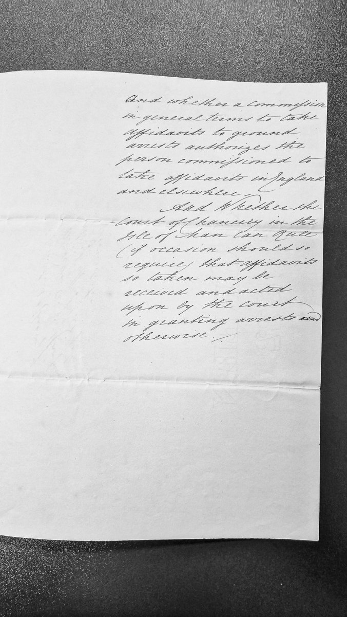 - A legal document posing two questions about the scope of a general commission to take affidavits for arrest proceedings: whether such a commission authorizes taking affidavits in England and elsewhere, and whether the Court of Chancery in the Isle of Man can rule on the admissibility of such affidavits in arrest proceedings.