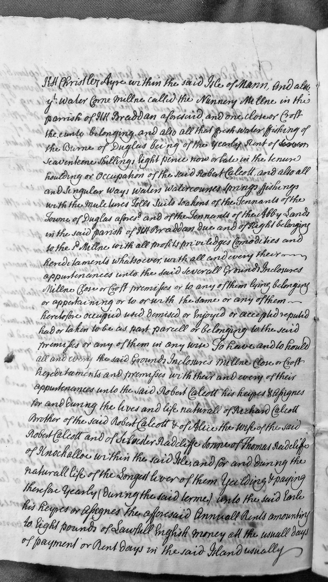 - A lease document granting Robert Calcott tenure of the Nunnery Mill in Braddan parish, Isle of Man, along with associated water rights, fishing privileges, and lands in Douglas. The lease is granted for the natural lives of Richard Calcott, Alice Calcott, and Silvester Radcliffe, with annual rent of eight pounds due to the Earl.