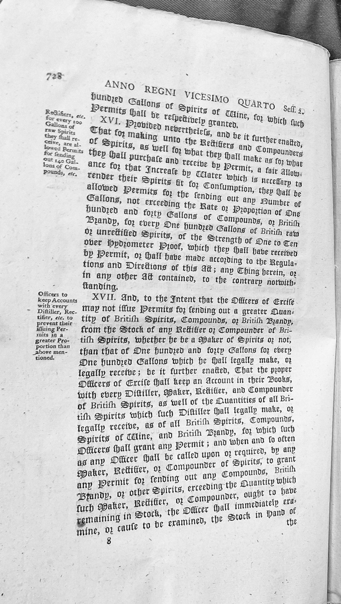 - A fragment of legislation (sections XVI and XVII) regulating the excise duties and permit system for rectifiers and compounders of spirits in the 24th regnal year. The text establishes allowances for water dilution in spirit production (140 gallons output per 100 gallons input) and requires excise officers to maintain detailed accounts with spirit makers to prevent over-issuance of permits.