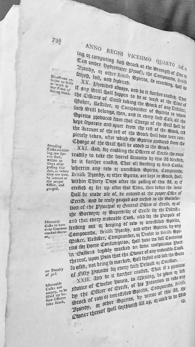 - This is an excerpt from a legislative act regulating the excise duties on spirits in Britain. The document outlines provisions for officers to take stock of spirits, requirements for cask marking and registration, penalties for non-compliance, and procedures for handling spirits during stock-taking operations.