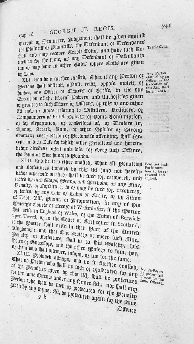 - This is a printed excerpt from Chapter 46 of an Act of King George III relating to excise regulations, spirits, and distillation. It sets forth penalties for obstructing excise officers (£200), procedures for recovering penalties and forfeitures, and provisions against double prosecution for the same offence.