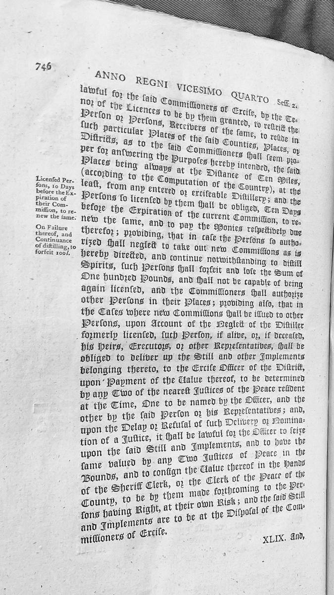 - This is an excerpt from legislation (Anno Regni Vicesimo Quarto, Session 2) establishing regulations for Excise Commissioners granting licenses to distillers. It specifies requirements for licensed persons including residential restrictions (10 miles from distilleries), renewal of commissions, penalties for non-compliance (£100 forfeiture), and procedures for seizure and valuation of stills and implements.