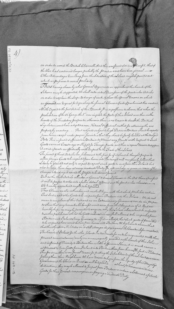 - A formal petition arguing for the repeal of parliamentary acts restricting trade to the Isle of Man, particularly regarding the importation of foreign and East India goods. The petitioner compares the Isle of Man's restrictions unfavorably to those imposed on Ireland, Jersey, and Guernsey, advocating for equal trading privileges and citing geographical and strategic advantages that would justify relaxed duties.