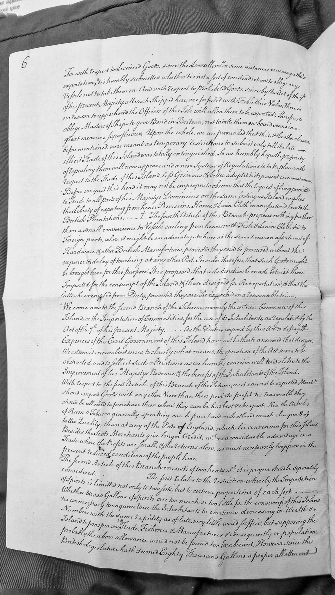 A detailed legal and commercial memorandum proposing reforms to the trade regulations of the Isle of Man. The document addresses restrictions on licensed and prohibited goods, export of provisions and manufactures, and the regulation of interior commerce through duties and import restrictions, arguing for modifications to existing acts to improve both the king's revenue and the islanders' circumstances.