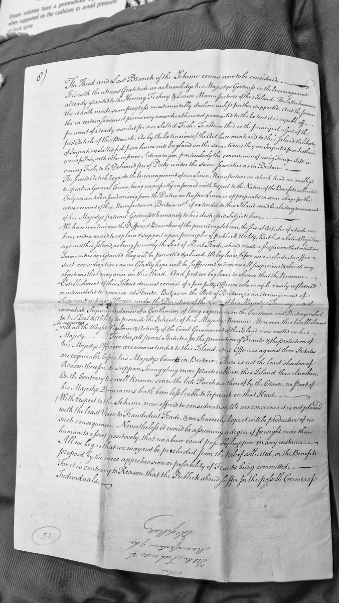 This document presents the third and final branch of a scheme to encourage herring fishery and linen manufacture on the Isle of Man. It argues for extending English trade privileges to Manx-produced salted fish and for funding Manx linen manufacture through duties on Russian linen. The document addresses concerns about the island's historical reputation for smuggling by detailing revenue establishment safeguards and legal protections now in place.