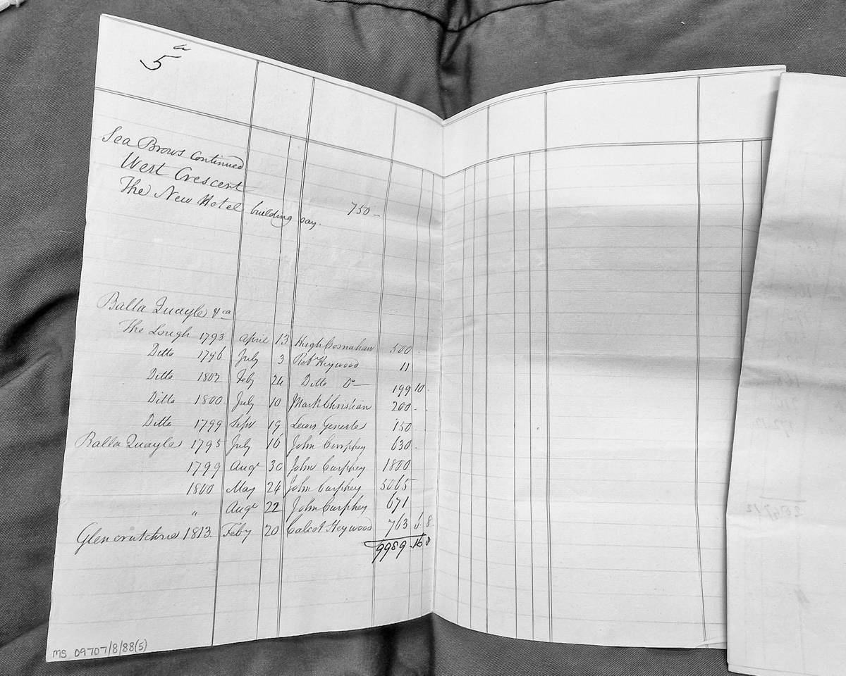 A financial abstract listing property valuations and payments for locations including Sea Brows (West Crescent), The Lough at Balla Quayle, and Glencrutchres. The document records multiple transactions dated between 1793 and 1813, with amounts in pounds, shillings and pence, and identifies various payers including Hugh Bernahan, Robert Heywood, Mark Christian, Lewis Geneste, and John Curphey.