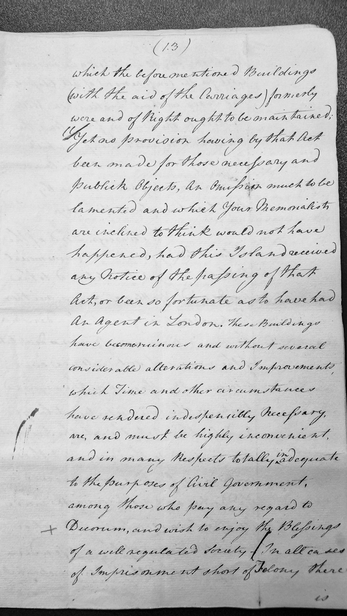 - This is an excerpt from a petition (page 13) concerning the state of public buildings on the Isle of Man. The memorialists argue that an Act of Parliament failed to provide adequate provisions for maintaining necessary public buildings, which have fallen into disrepair. They lament the Island's lack of representation in London and request consideration for alterations and improvements needed for proper civil government.