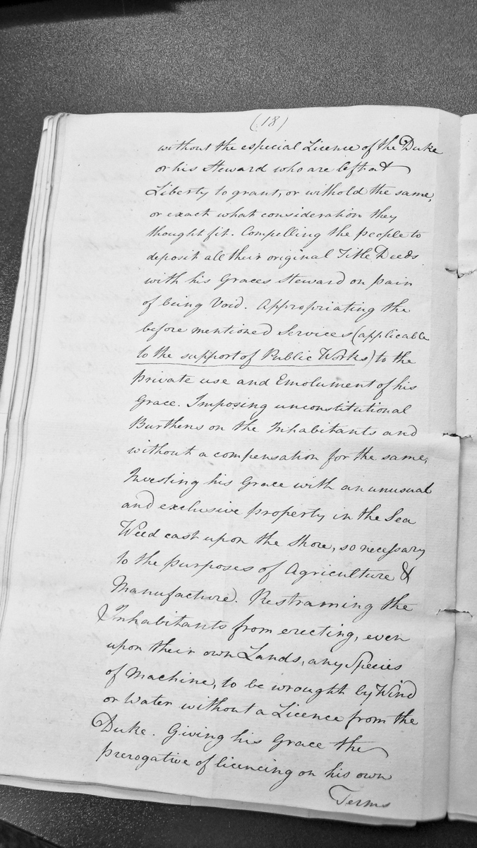 - A formal petition or legal document detailing grievances against the Duke's exercise of authority over the inhabitants. It complains of arbitrary licensing requirements, confiscation of title deeds, appropriation of public services for private use, restrictions on manufacturing, and exclusive claims to sea resources.