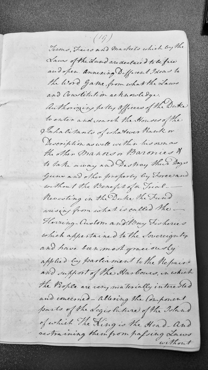 - A petition objecting to proposed changes to Manx law, including restrictions on free markets and fairs, new definitions of 'game', authorization for officers to search homes and seize property, reallocation of herring customs revenue, and alterations to the island's legislature. The document expresses concern about loss of parliamentary protections and sovereignty.