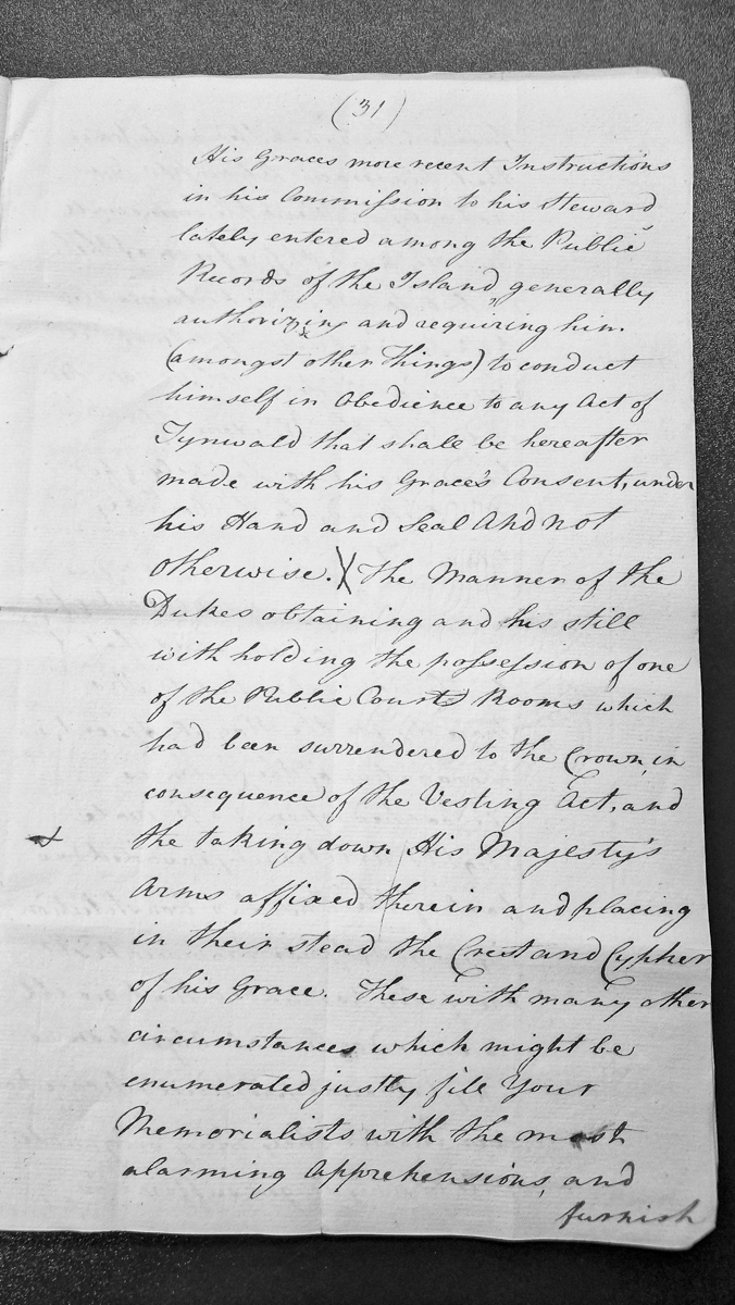 - This is a fragment of a petition (memorial) addressing concerns about the Duke's recent instructions to his Steward, his authority over acts of Tynwald, and his appropriation of a public court room. The memorial expresses alarm about the Duke's conduct regarding Crown property and the removal of the King's Arms in favor of the Duke's insignia.