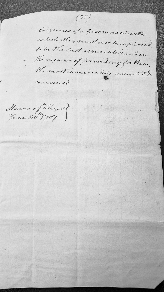 - A fragment of a House of Keys document dated June 30th 1787 concerning the exigencies of government and the means of providing for them. The text appears to be part of a larger judgment or resolution discussing governmental matters and the responsibilities of the House of Keys.