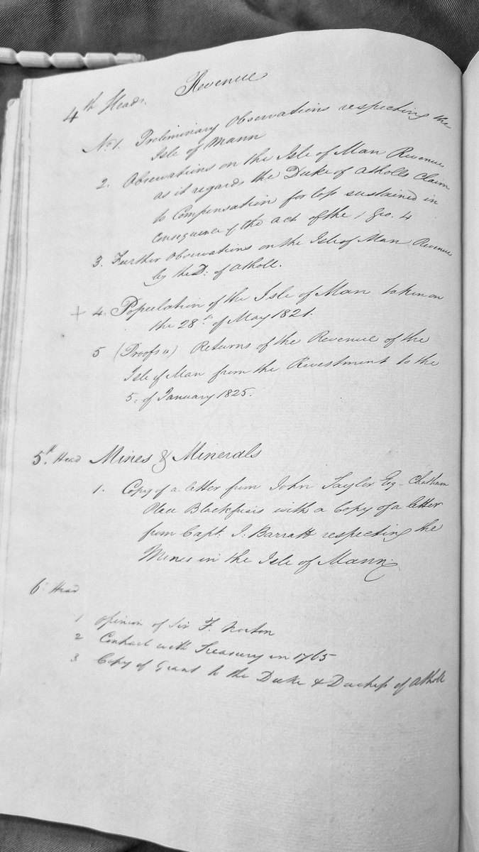 An index or table of contents for a collection of administrative and revenue documents pertaining to the Isle of Man, including observations on revenue claims by the Duke of Atholl, population data from 1821, and correspondence regarding mines and minerals. This appears to be a finding aid or organizational document for archival materials.