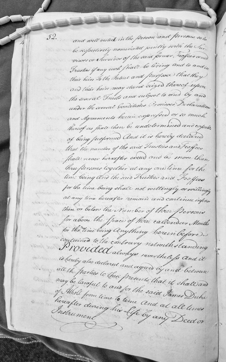 This is an excerpt from a trust deed or settlement document establishing provisions for trustees and feoffees managing property. The document specifies that no more than three trustees shall hold the property at any time, and that they must maintain this minimum number. It references James, Duke of Atholl, and his authority to make changes by deed during his lifetime.